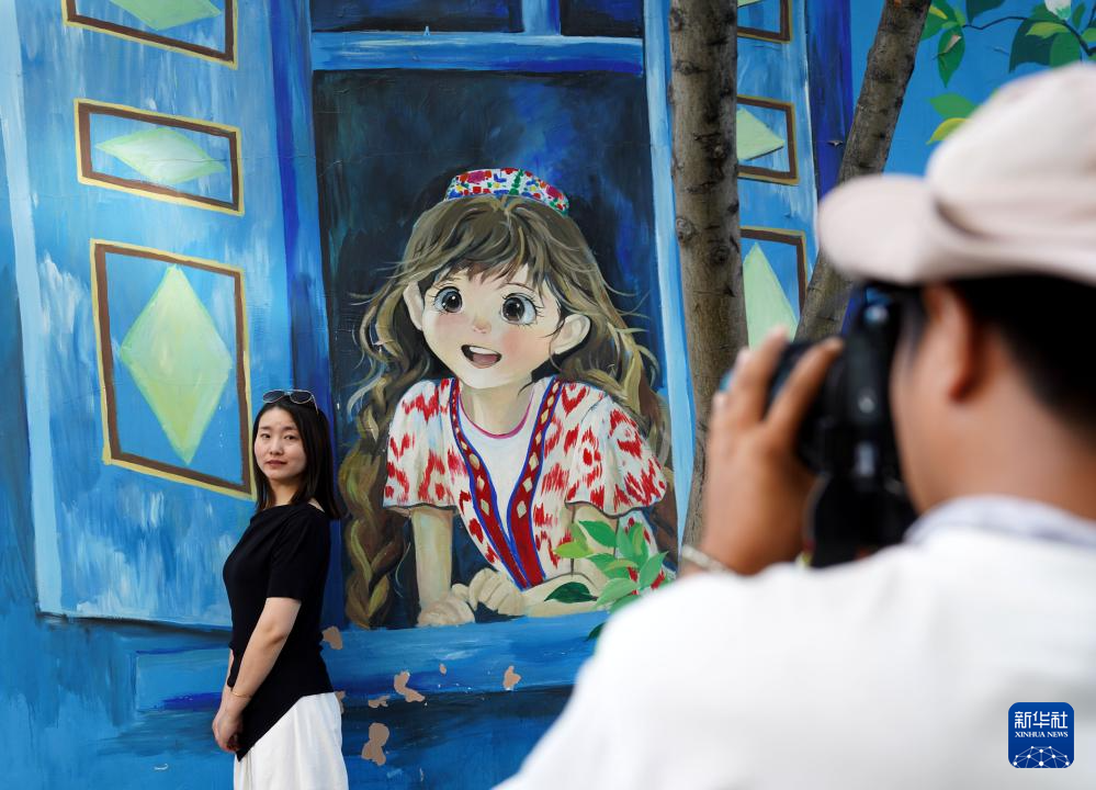 8月4日,在新疆伊犁哈萨克自治州伊宁市六星街,游客在一处涂鸦墙前留影。