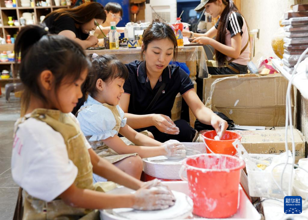 8月4日,在新疆伊犁哈萨克自治州伊宁市六星街,两名小游客在体验陶艺制作。