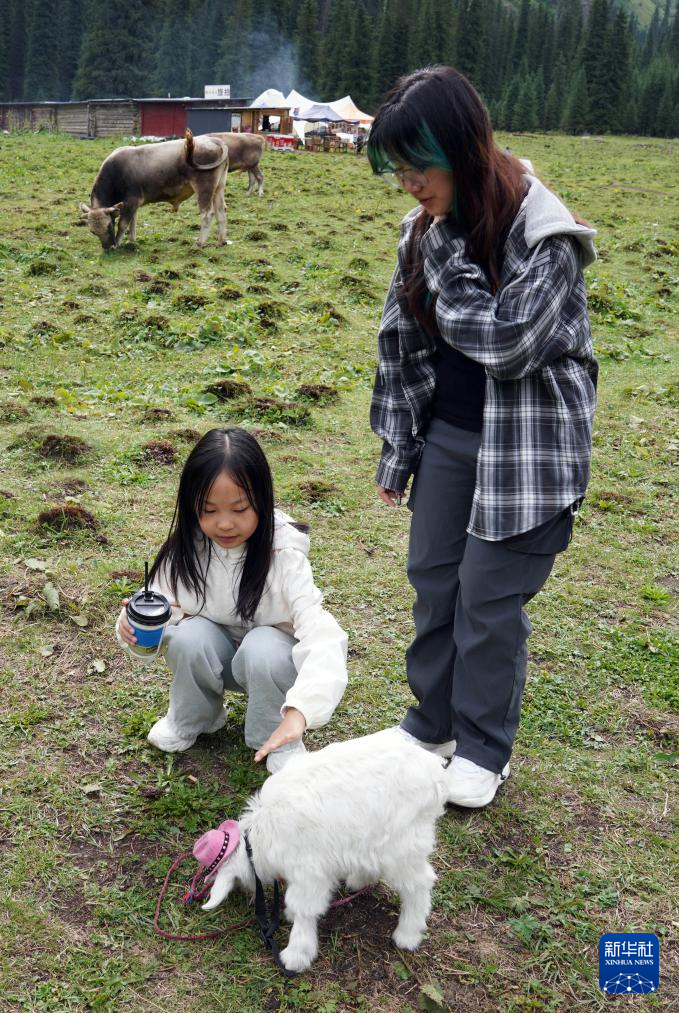 7月30日,在新疆伊犁哈萨克自治州昭苏县夏塔景区,游客与小动物互动。