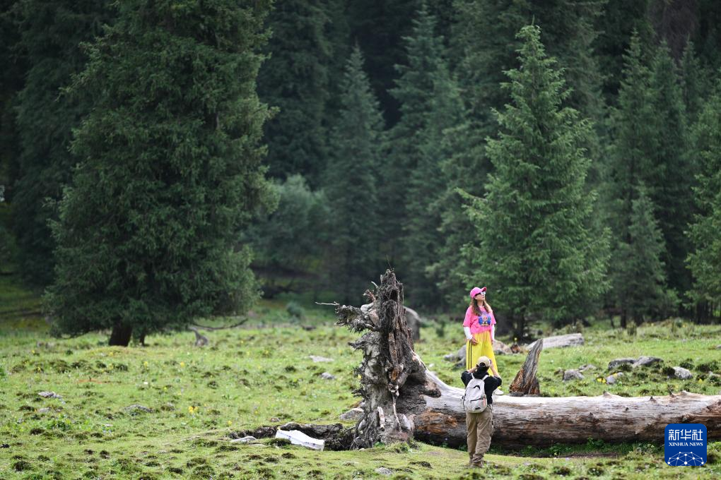 7月30日,游客在新疆伊犁哈萨克自治州昭苏县夏塔景区内留影。