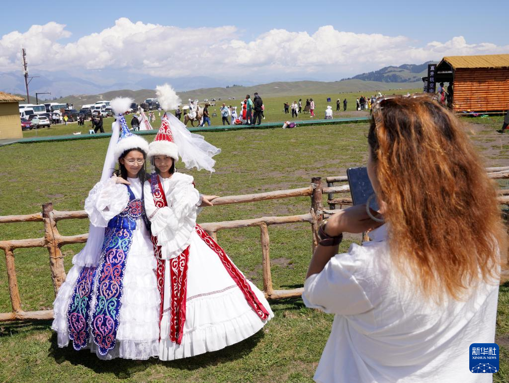8月3日,在新疆伊犁哈萨克自治州新源县那拉提景区,两名游客身着民族服饰合影留念。