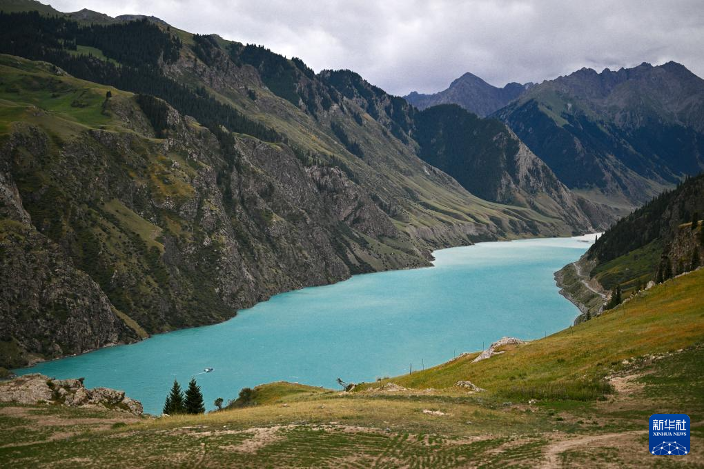 7月30日,游船行驶在新疆伊犁哈萨克自治州昭苏县玉湖的水面上。