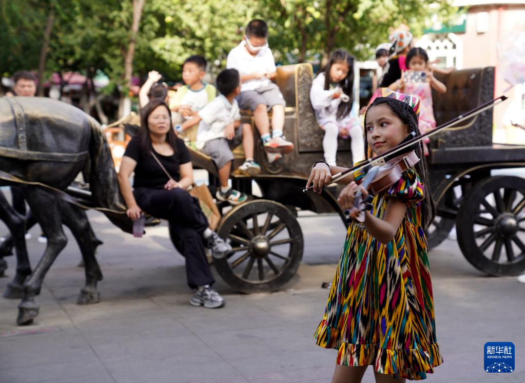 8月4日,在新疆伊犁哈萨克自治州伊宁市六星街,一名维吾尔族小女孩为游客演奏。
