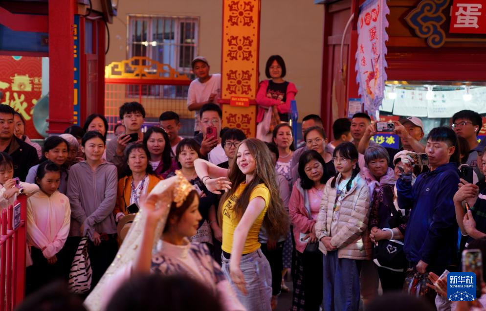 7月31日,在新疆伊犁哈萨克自治州特克斯县八卦城的“八卦城之夜”市集,游客在欣赏民族舞蹈表演。