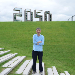 王坚在杭州云栖小镇“2050博悟馆”前留影(7月31日摄)。