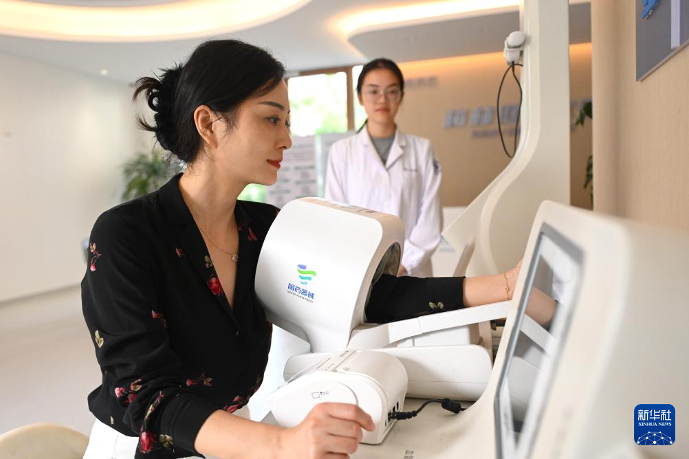 8月4日,一名女士在浙江省杭州市萧山区梅林村的智慧健康小站自助测量血压。