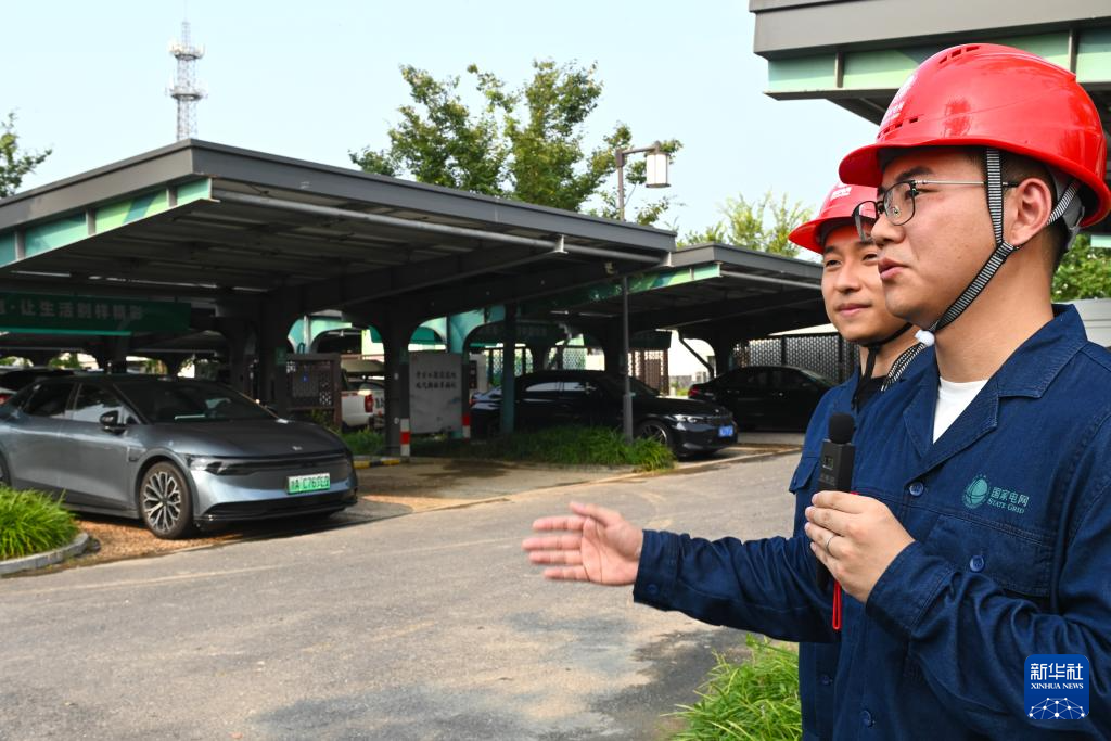 8月4日,在浙江省杭州市萧山区梅林村,技术人员介绍光充储一体化充电站。