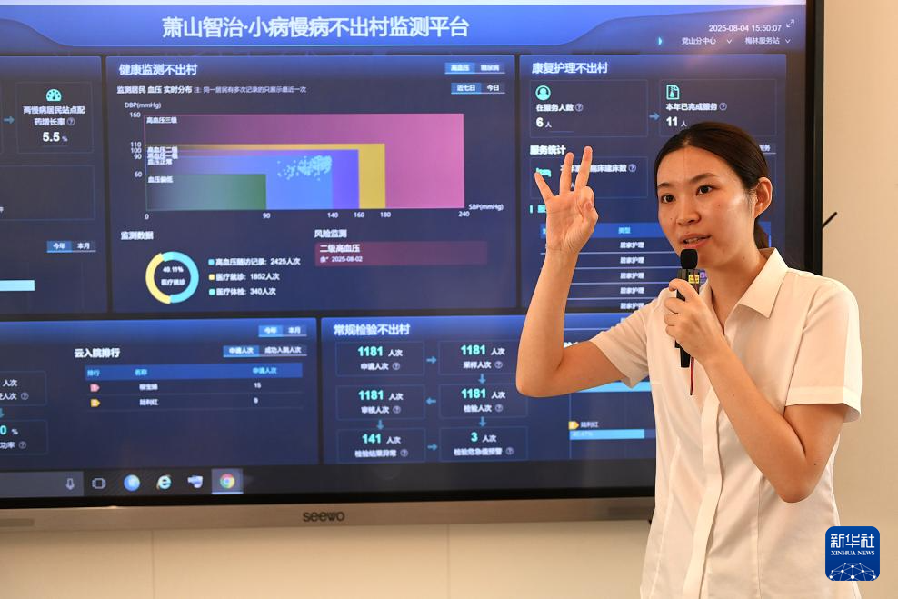 8月4日,在浙江省杭州市萧山区梅林村,工作人员介绍智慧健康监测平台。
