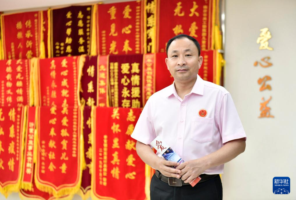 8月5日,徐军在临沂市手牵手孤困儿童心理辅导志愿服务团的锦旗前留影。