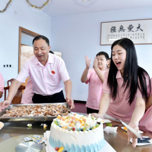 8月5日,在临沂市临沭县孤困儿童心灵家园,徐军(左二)为孩子们端上菜肴。