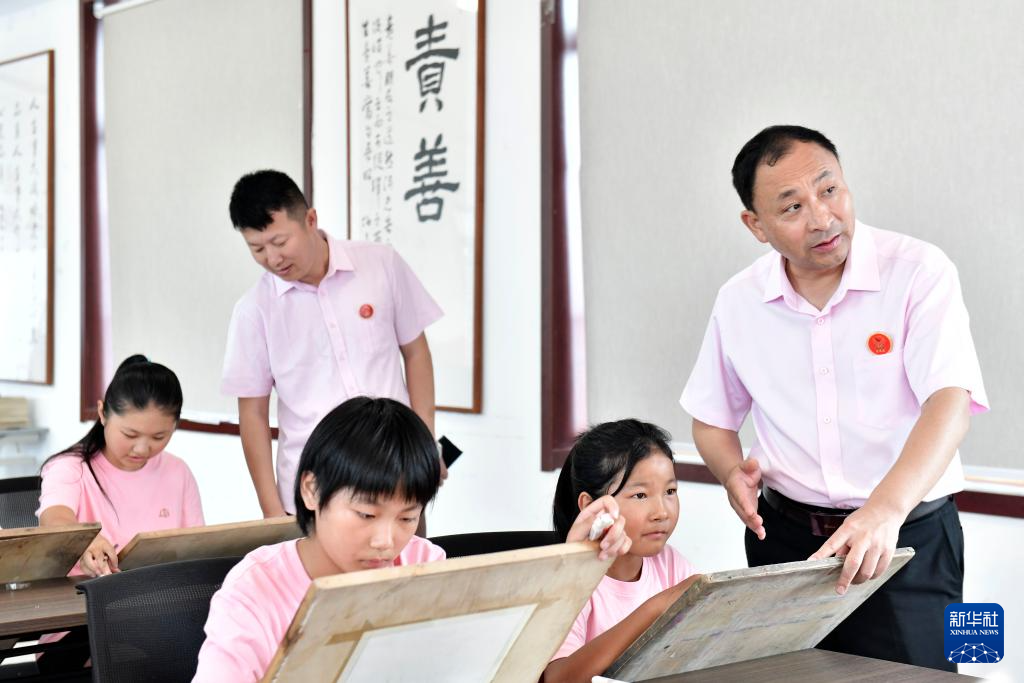 8月5日,在临沂市临沭县孤困儿童心灵家园,徐军(右一)陪伴孩子们学画画。