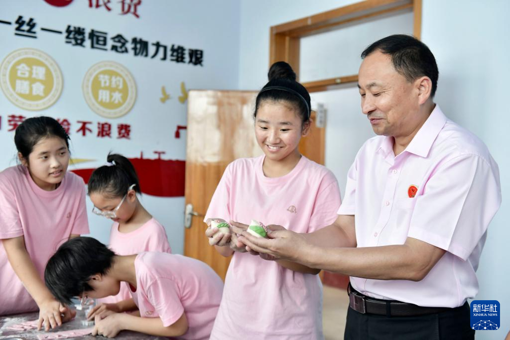 8月5日,在临沂市临沭县孤困儿童心灵家园,徐军(右一)和孩子们一起做面点。
