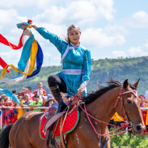 8月7日,演员在农牧民那达慕大会上表演马术。