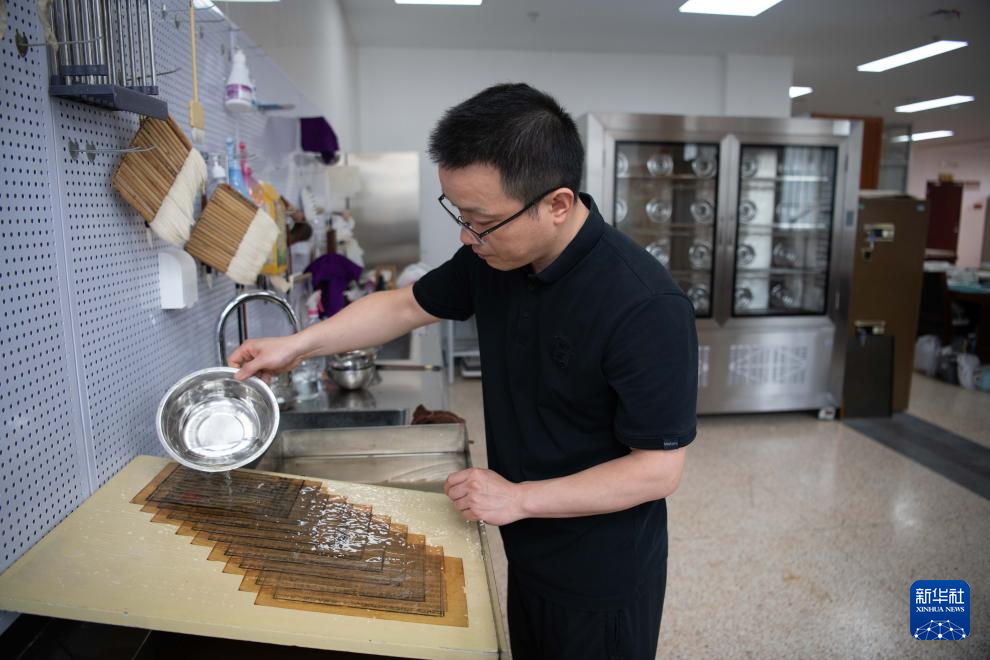 8月5日,在安徽省图书馆内,古籍修复师臧春华将经过清洗的书叶晾干。