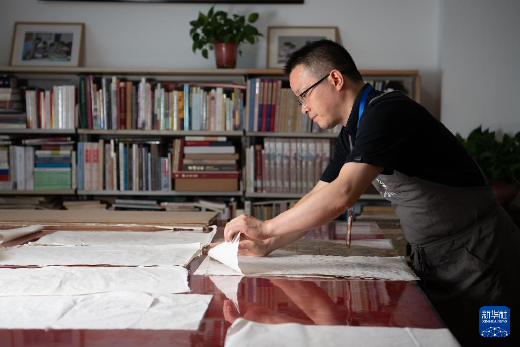 6月17日,在安徽省图书馆内,古籍修复师金鑫在进行古籍修复。