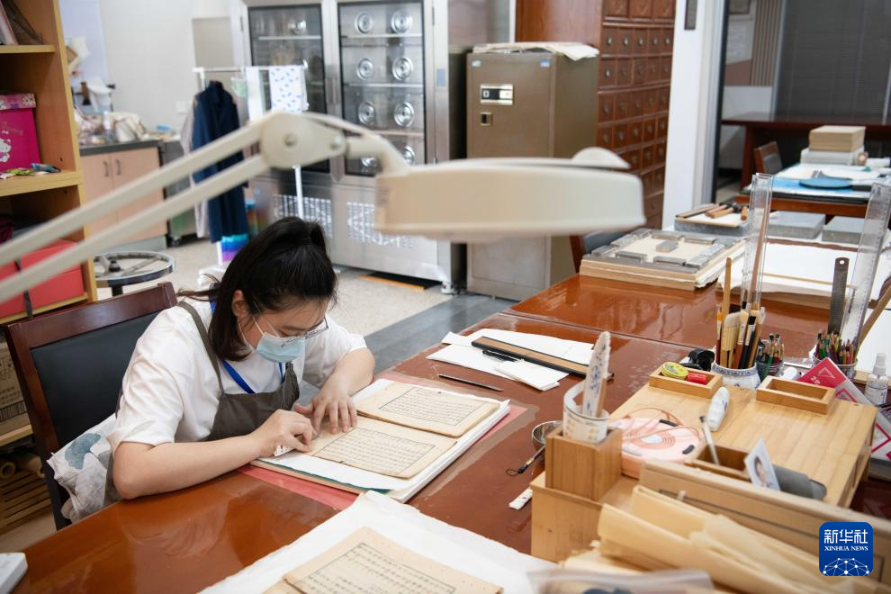 6月17日,在安徽省图书馆内,古籍修复师耿宁在修补书叶。
