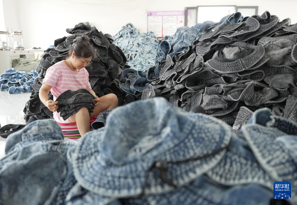 8月8日,河北省昌黎县一家制帽企业的工人在生产车间工作。