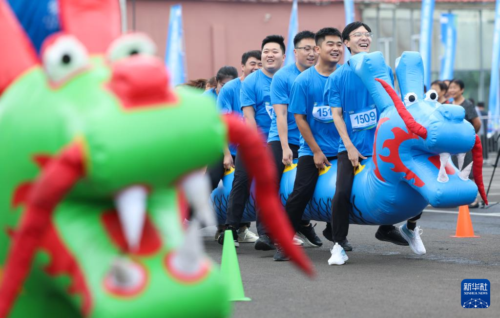 8月8日,在河北省石家庄市正定县塔元庄村举办的“全民健身日”乡村运动会上,参赛群众进行“旱地龙舟”比赛。
