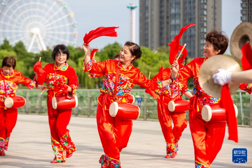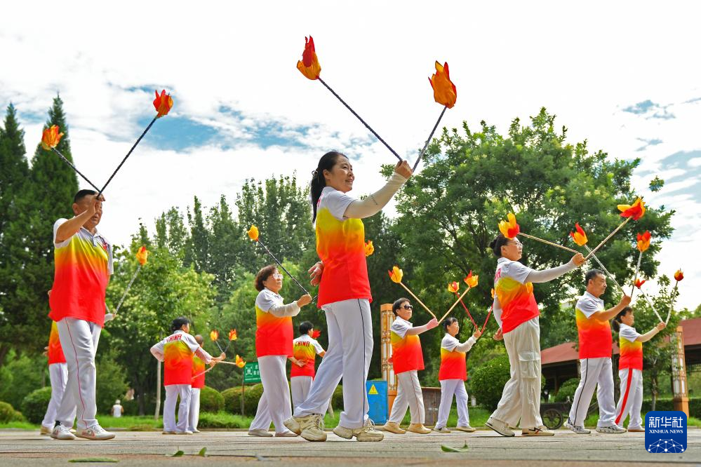 8月8日,江苏省南通市通州区金新街道的舞蹈爱好者在南山湖公园打腰鼓。