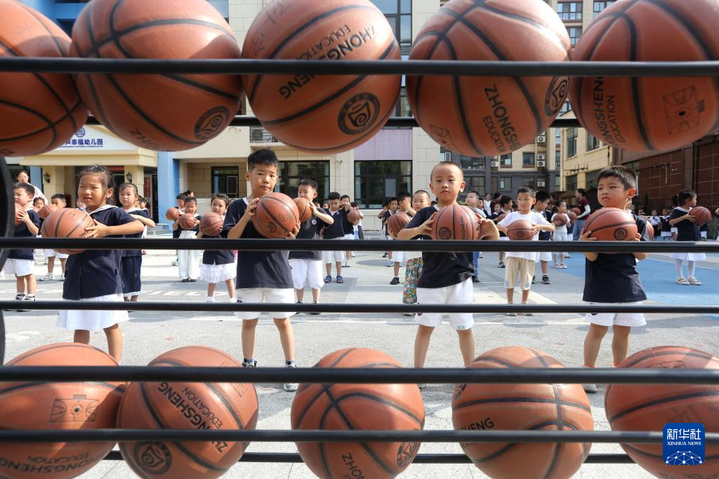 8月8日,在江苏省连云港市钟声幸福幼儿园,小朋友练习花式篮球。