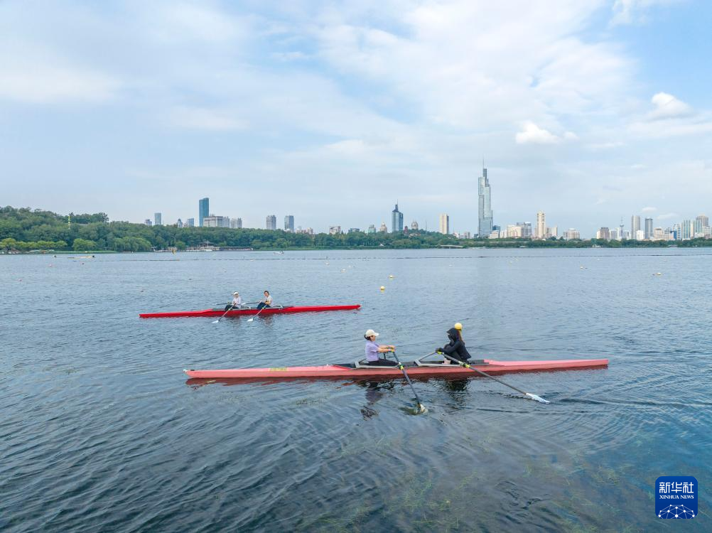 8月8日,市民在江苏省南京市玄武湖公园划艇(无人机照片)。