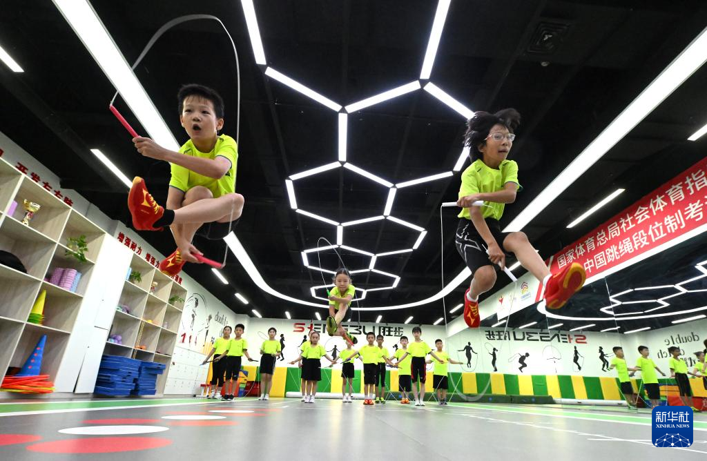 8月8日,小朋友在河北省石家庄市长安区一家跳绳运动体能馆练习跳绳。