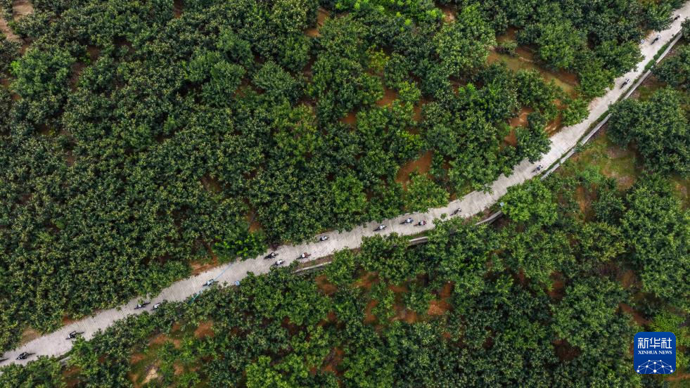 8月8日,骑行爱好者在河北省遵化市苏家洼镇二道岭村骑行(无人机照片)。