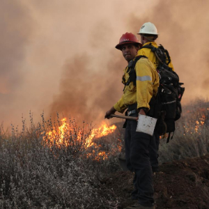 8月7日,在美国加利福尼亚州文图拉县,消防员在山火现场作业。
