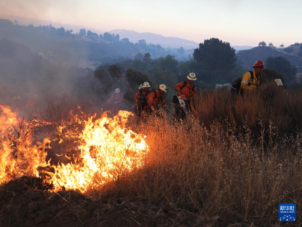 8月7日,在美国加利福尼亚州文图拉县,消防员在山火现场观察火情。
