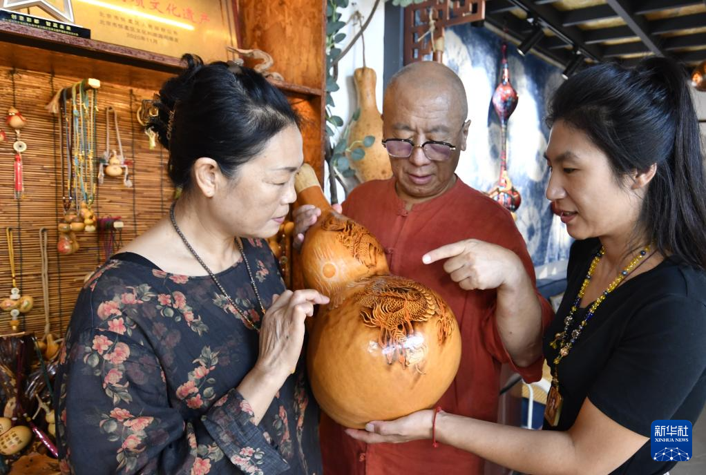 在怀柔区桥梓镇禧宝露文化中心,怀柔区非物质文化遗产焦家浸烙葫芦代表性传承人焦宇(中)为来宾讲解烙制葫芦的技艺(8月6日摄)。