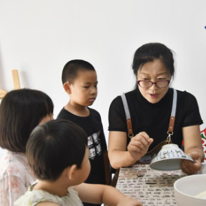 在怀柔区桥梓镇禧宝露文化中心,陶瓷锔补技师张凤琴(右二)为周边村里的孩子上暑期传统文化课(8月6日摄)。