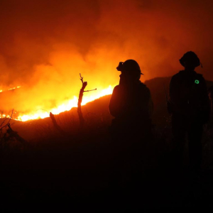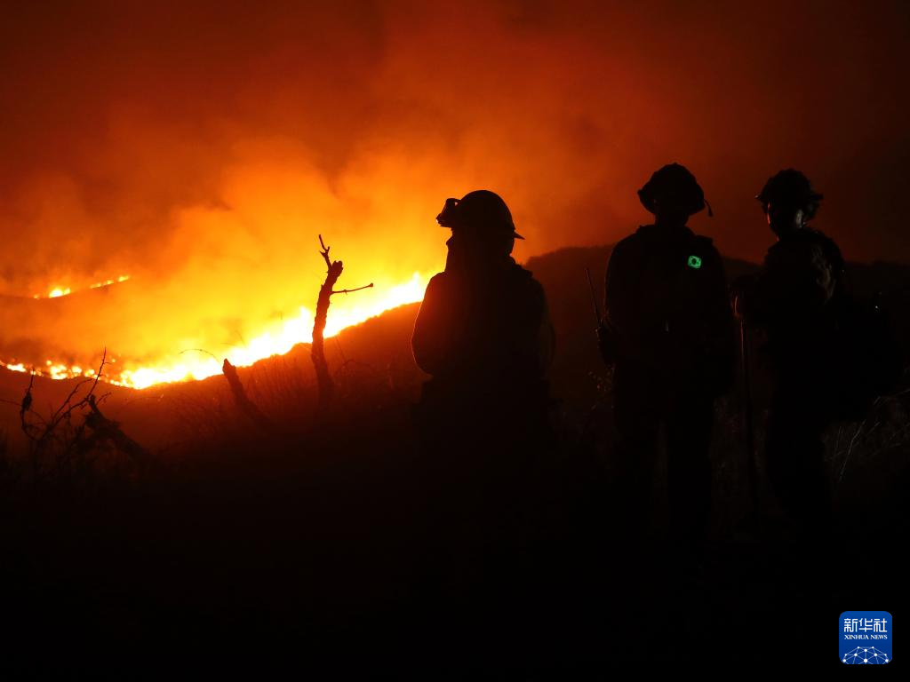 8月7日,在美国加利福尼亚州文图拉县,消防员在山火现场查看火情。