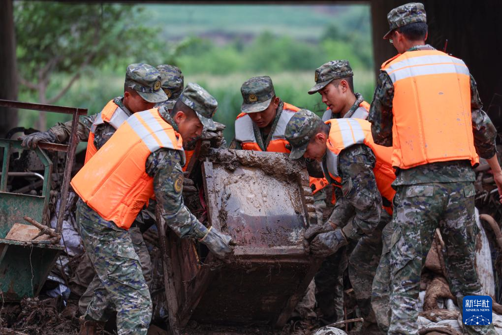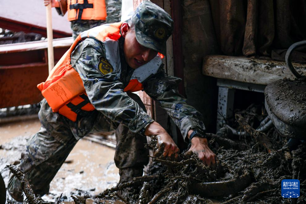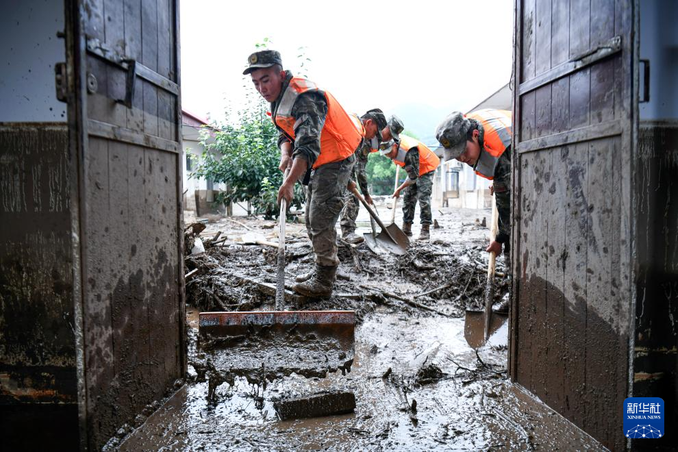 8月9日,武警甘肃总队机动支队官兵在兰州市榆中县城关镇兴隆山村清理淤泥。