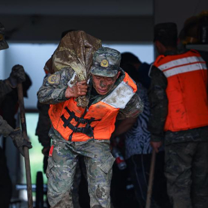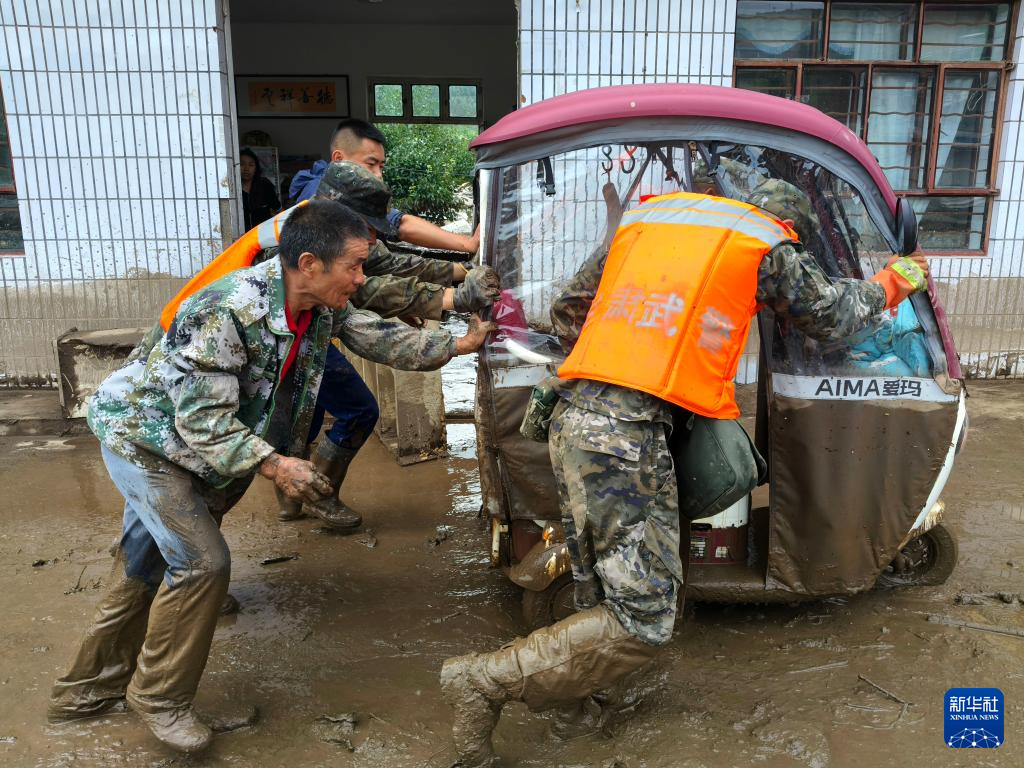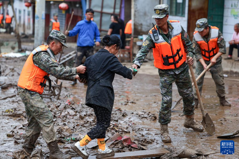 8月9日,武警甘肃总队官兵在兰州市榆中县马莲滩村、兴隆山村、新营镇、小康营乡、旧庄沟村等5个方向,展开转移被困群众、转运受损车辆、清理淤泥等任务。