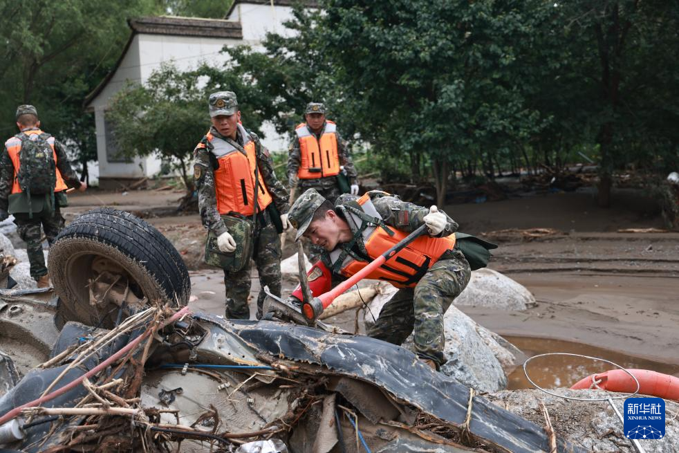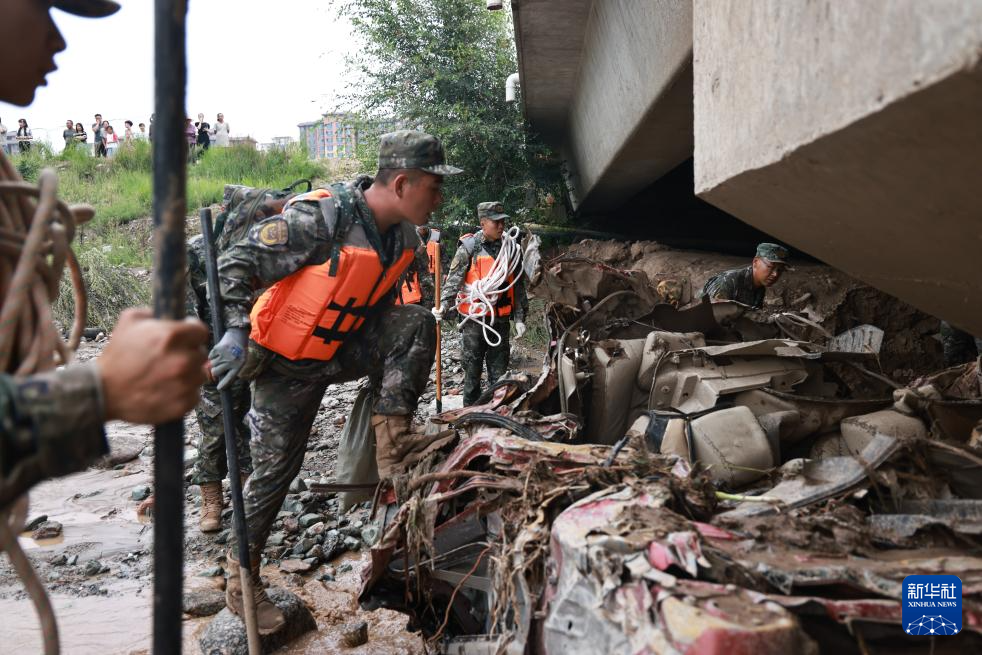 8月9日,武警甘肃总队兰州支队官兵在兰州市榆中县城河道搜索受灾村民丢失物资。