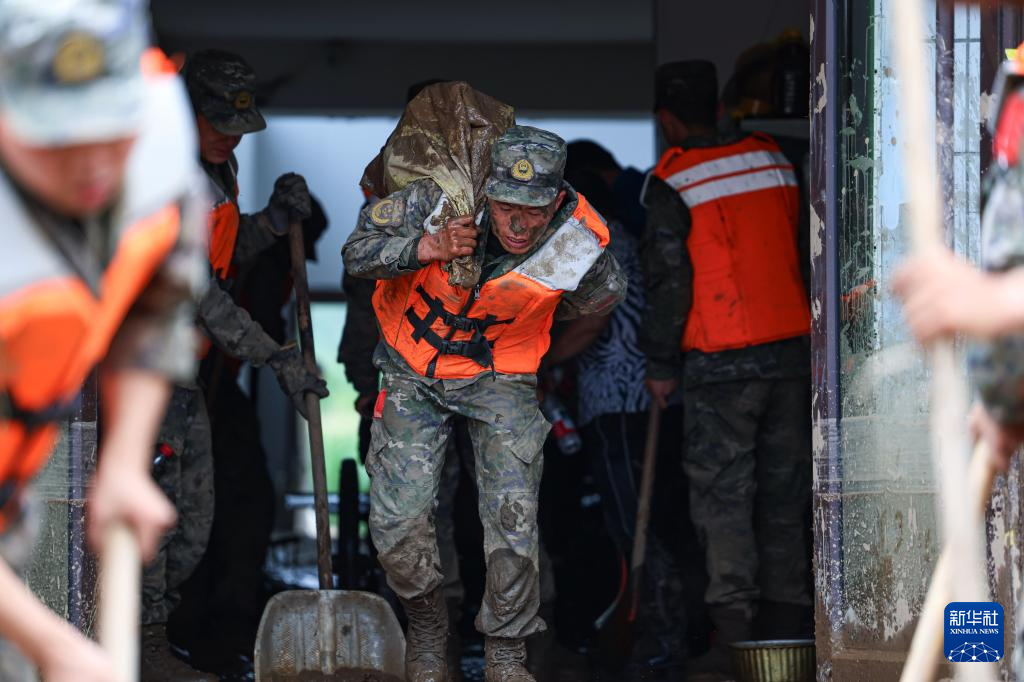 8月9日,武警甘肃总队机动支队官兵在兰州市榆中县城关镇兴隆山村清理杂物。