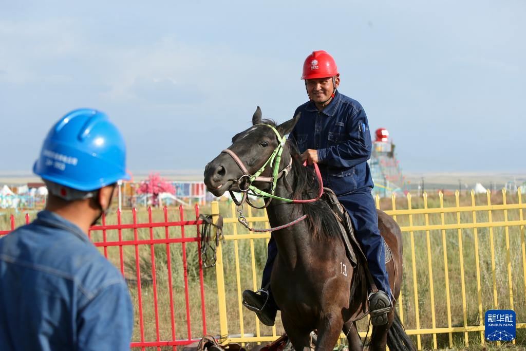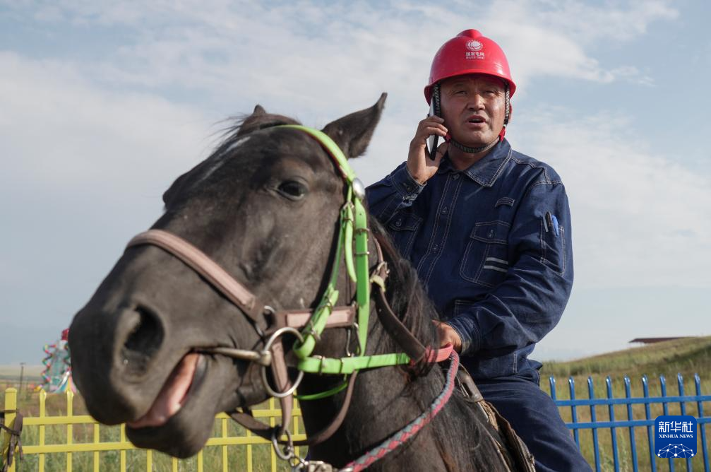 阿曼吐尔·依沙木丁在位于新疆昭苏县的天马旅游文化园景区草场上进行线路巡查(7月19日摄)。