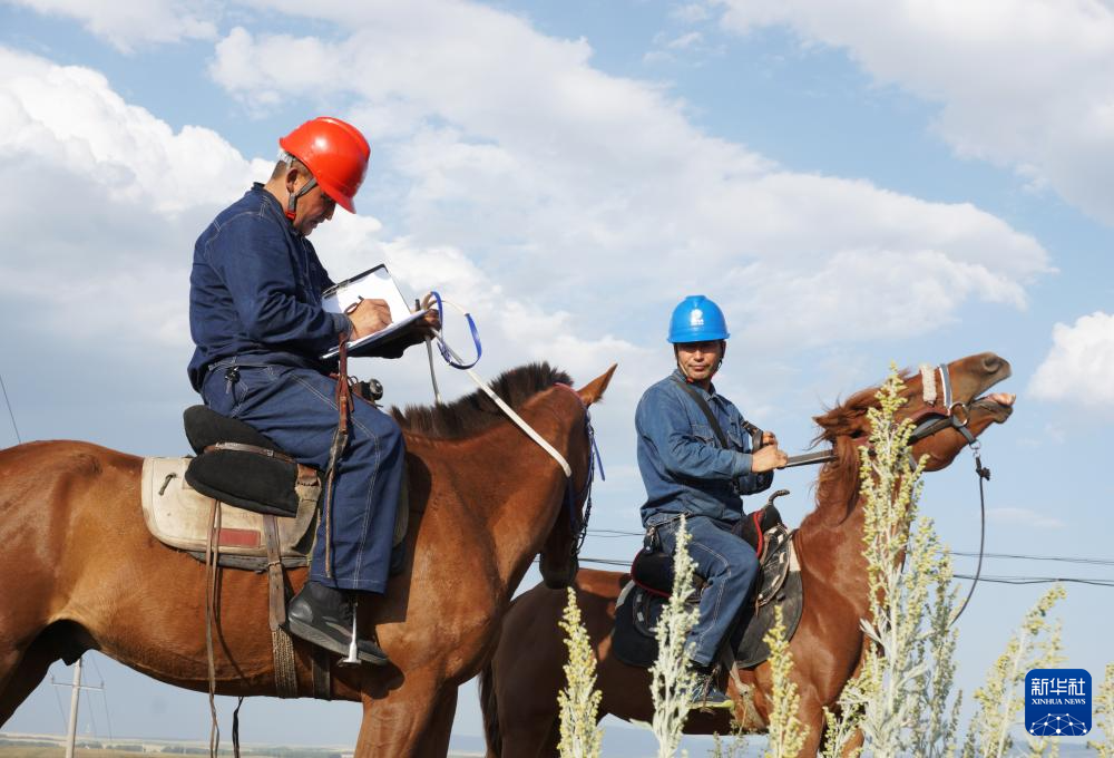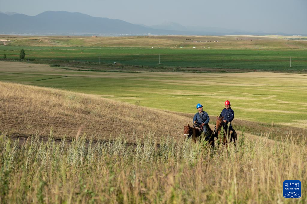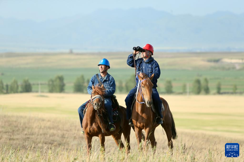 阿曼吐尔·依沙木丁(右)和同事吉恩斯·木苏热提江在位于新疆昭苏县的天马旅游文化园景区草场上进行线路巡查(7月19日摄)。