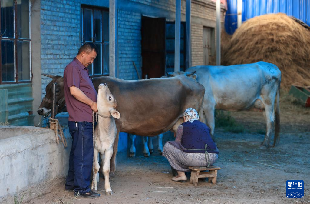 在位于新疆昭苏县萨尔阔布乡的母亲家中,阿曼吐尔·伊沙木丁陪母亲挤牛奶(7月20日摄)。