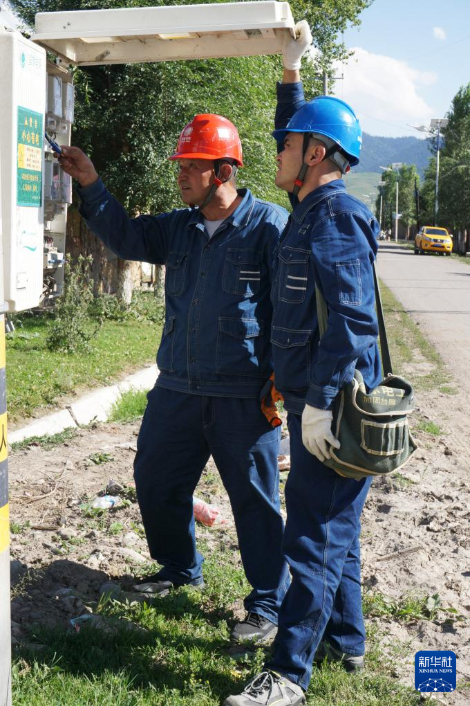 在新疆昭苏县萨尔阔布乡,阿曼吐尔·依沙木丁(左)和徒弟叶尔那克·沙尔巴特在语言障碍者沙依拉古丽·胡阿提汗家中进行安全用电检查(7月18日摄)。