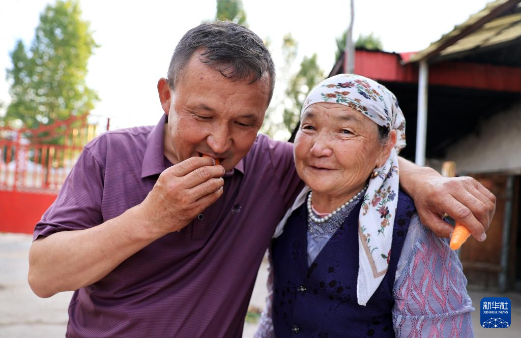 在新疆昭苏县萨尔阔布乡,阿曼吐尔·伊沙木丁吃着母亲种的胡萝卜(7月20日摄)。