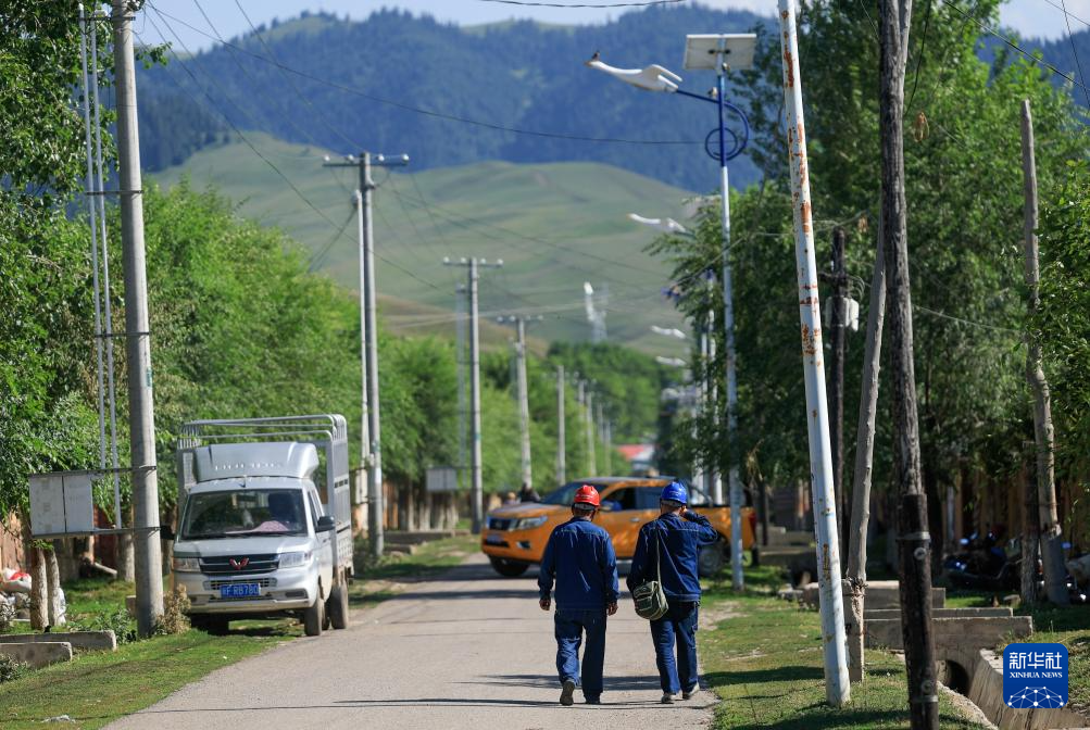 阿曼吐尔·依沙木丁(左)和徒弟叶尔那克·沙尔巴特在萨尔阔布乡进行线路巡查(7月18日摄)。