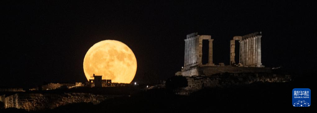 这是8月9日在希腊雅典附近苏尼翁角拍摄的波塞冬神庙和月亮。