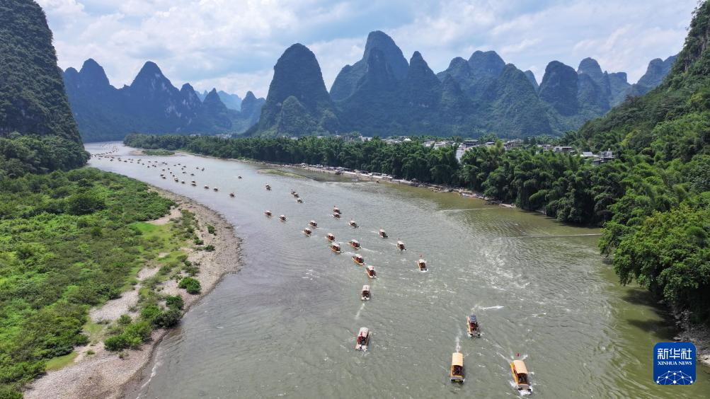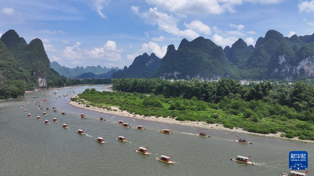 8月10日,在漓江广西桂林市阳朔县兴坪镇段,游客乘竹筏游玩赏景(无人机照片)。