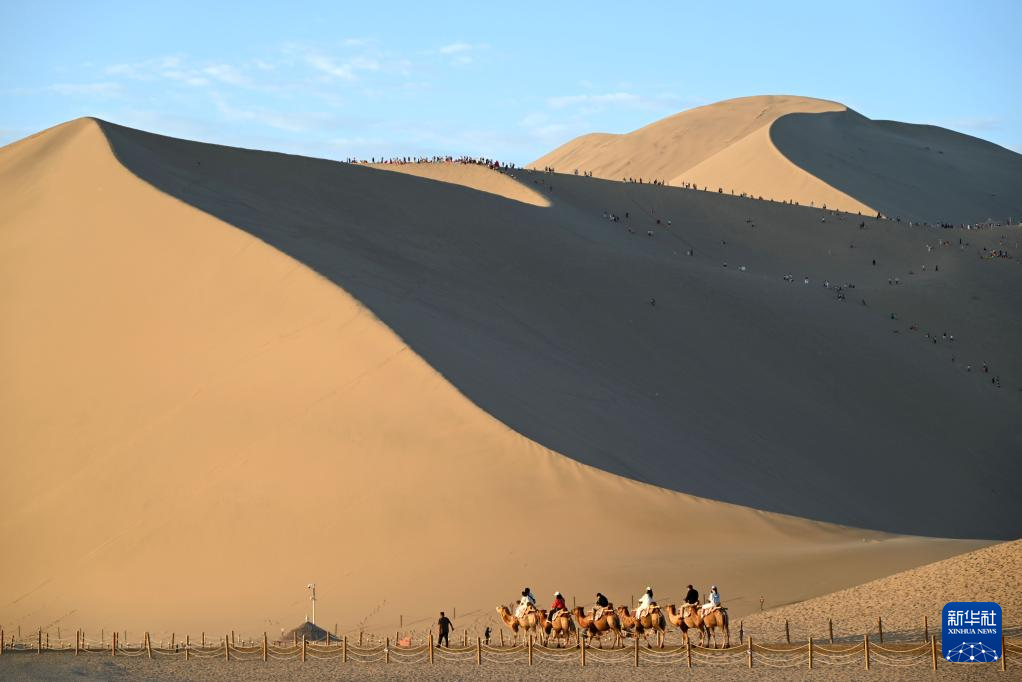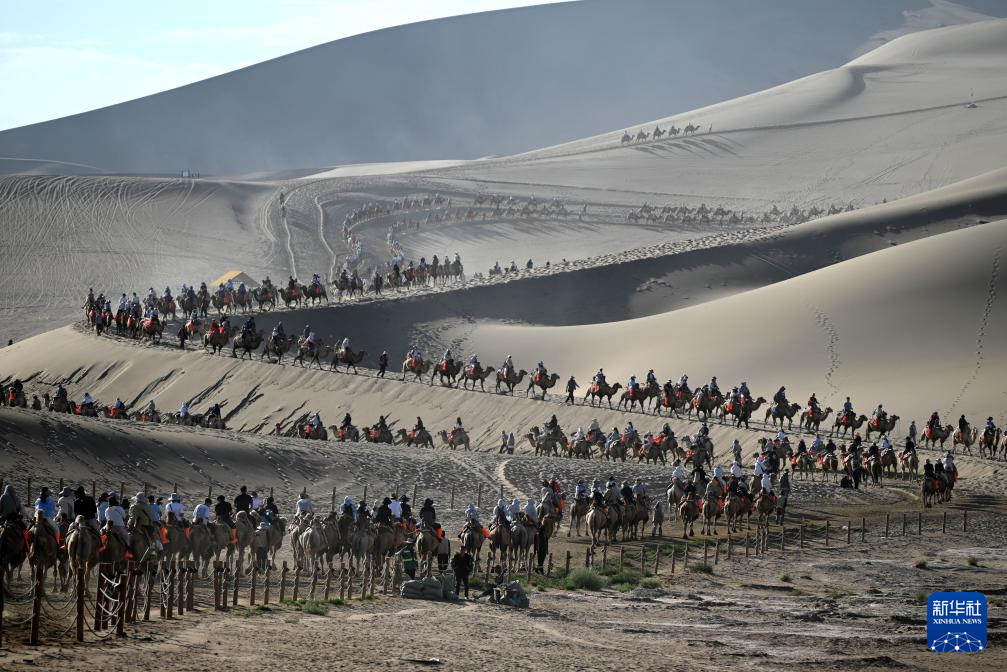 8月9日,游客在甘肃省敦煌市鸣沙山月牙泉景区游览。