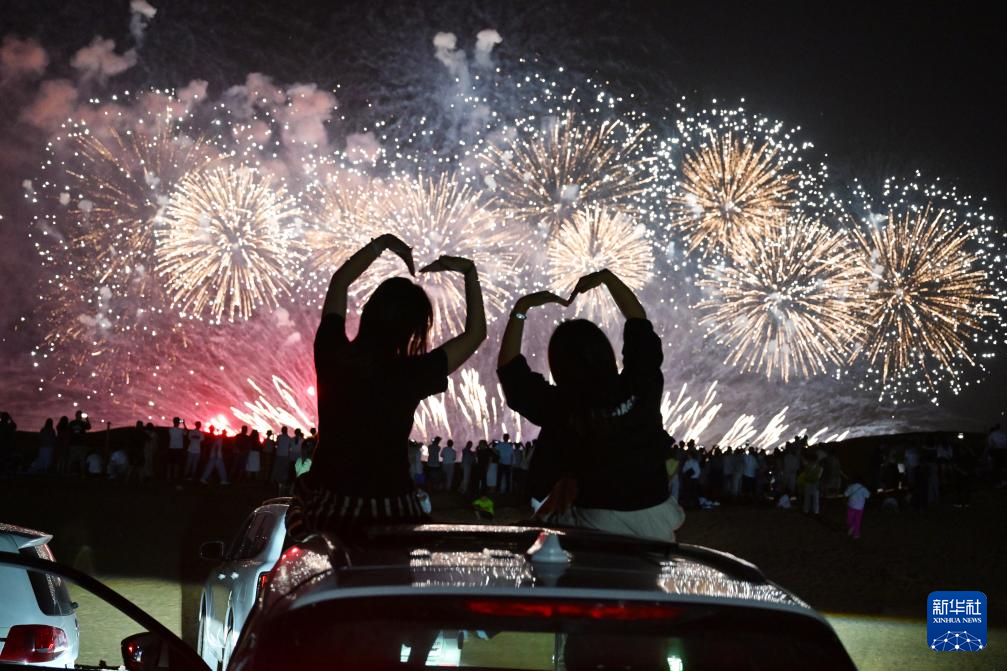 8月10日,游客在宁夏中卫市沙坡头区观看烟花表演。