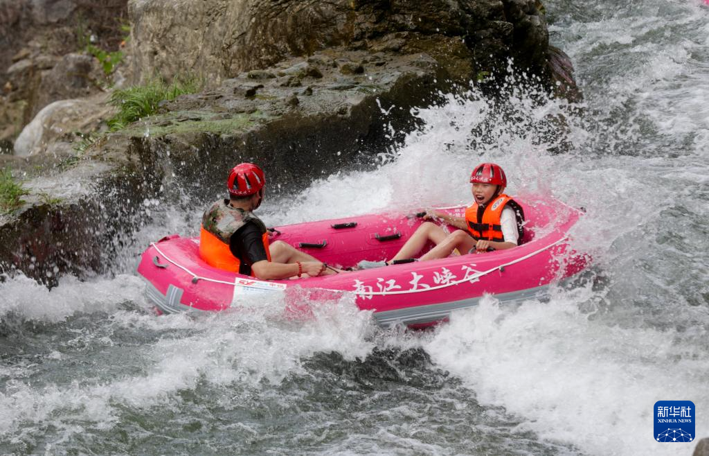 8月10日,游客在贵州省开阳县南江大峡谷景区漂流。