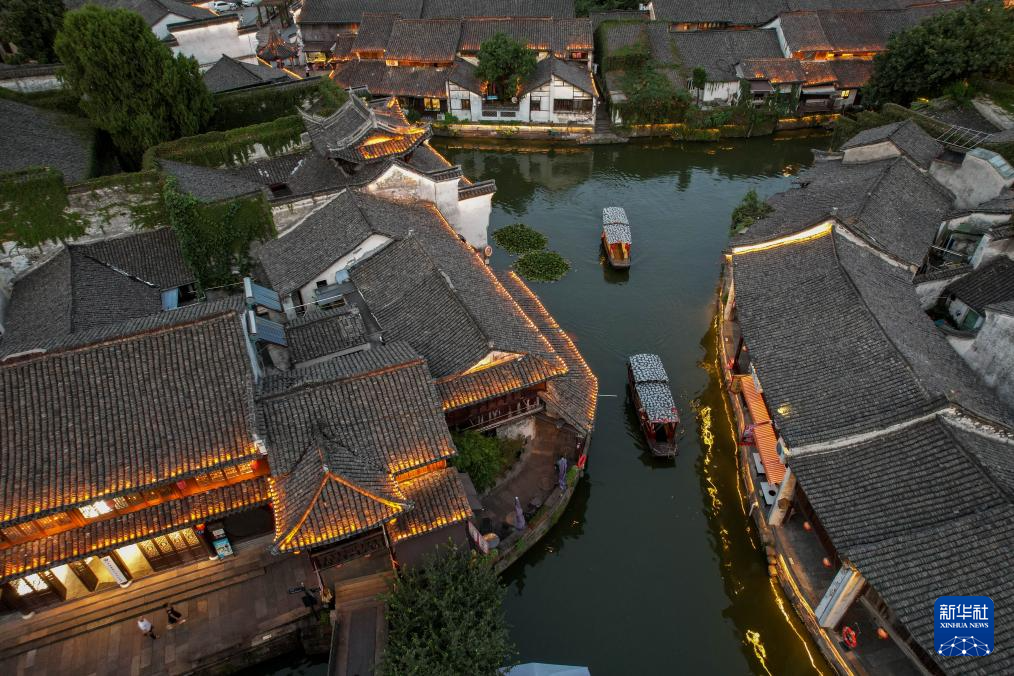 8月9日傍晚,游客在浙江省湖州市德清县新市古镇游玩(无人机照片)。