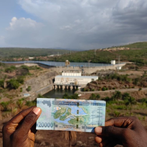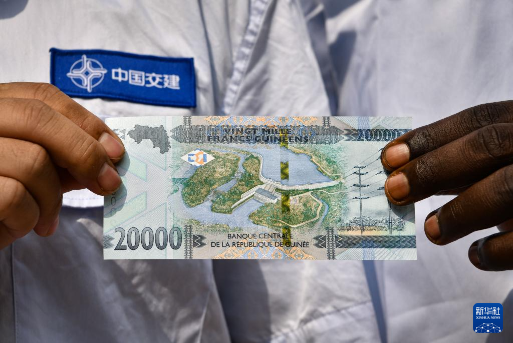 这是5月3日在几内亚杜布雷卡省以凯乐塔水电站为背景拍摄的印着水电站的2万几内亚法郎纸币。