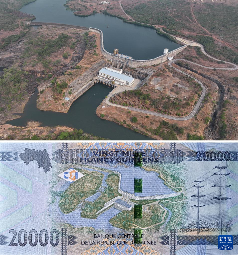 这张拼板照片展示的是:上图是4月24日在几内亚杜布雷卡省拍摄的凯乐塔水电站(无人机照片);下图是5月1日拍摄的印着凯乐塔水电站图案的2万几内亚法郎纸币。